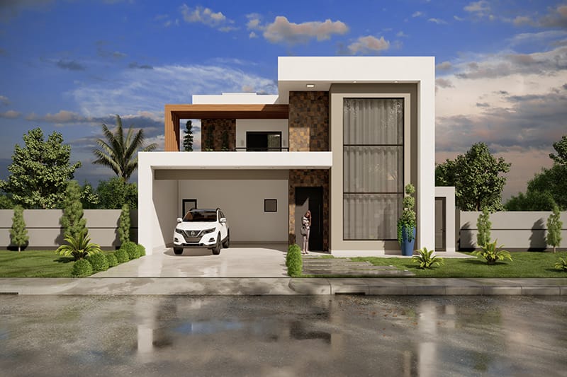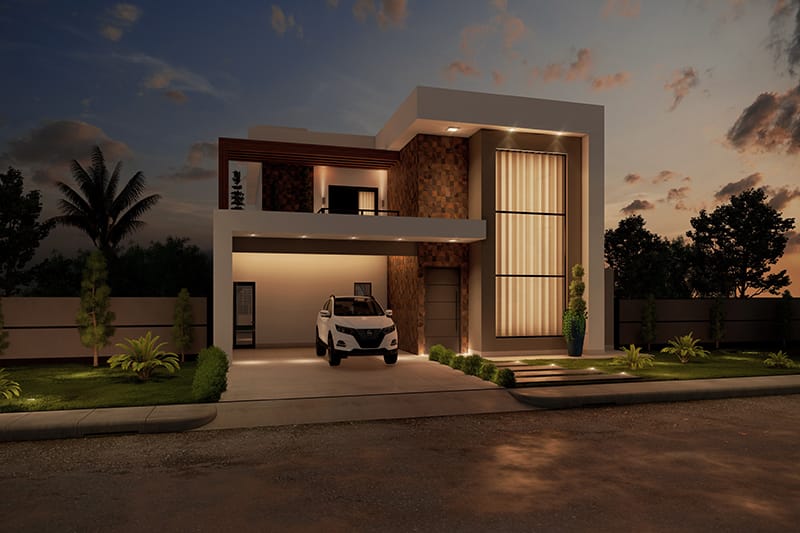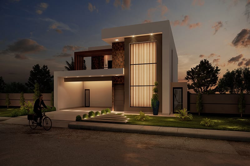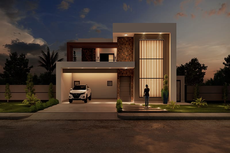 Esse item é essencial para a visualização mais realista de como ficará a fachada frontal. Renderizamos cenas noturnas e diurnas da fachada frontal.