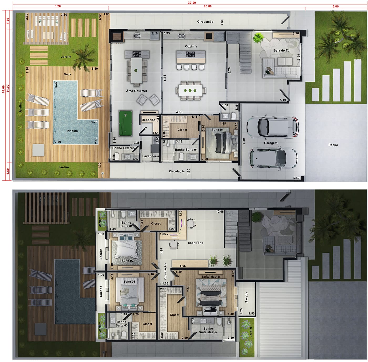 Para quem gosta de luxo, essa casa com design alto padrão é a escolha perfeita. Projetada pensando em espaço e conforto, esse projeto tem 4 suítes: uma no andar térreo e 3 no andar superior, sendo 2 suítes normais e uma suíte master. A cozinha com ilha cria uma fluidez na hora das refeições, além da integração com a sala de jantar. Um dos destaques é a sala de TV: com pé direito alto, é um ambiente luxuoso e agradável, perfeito para receber os amigos. A piscina complementa perfeitamente a área gourmet, sendo o centro das atenções nos fins de semana de reunião.