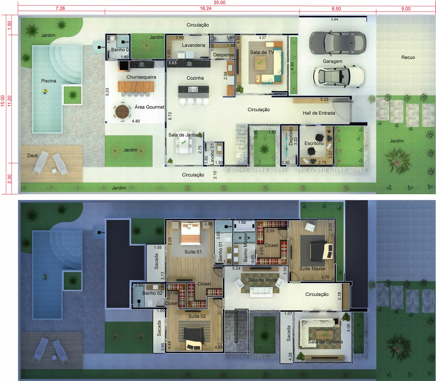 Esta planta apresenta a casa de forma artística, possibilitando a visualização dos móveis e vegetação.