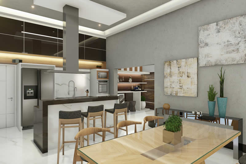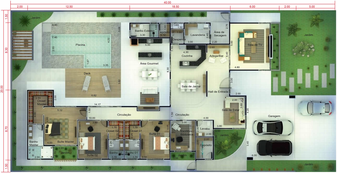 Esse é sem dúvida um projeto diferenciado para pessoas diferenciadas. Projetada para um terreno de 20 metros de largura por 40 metros de comprimento, essa casa é dividida em dois lados. O primeiro voltado a área íntima da casa, com as 3 suítes com closet. Já do outro lado temos a área de convívio, com sala de tv, adega, bar, cozinha e uma espaçosa área de lazer, para você receber bem seus convidados. A garagem conta com 3 vagas cobertas.