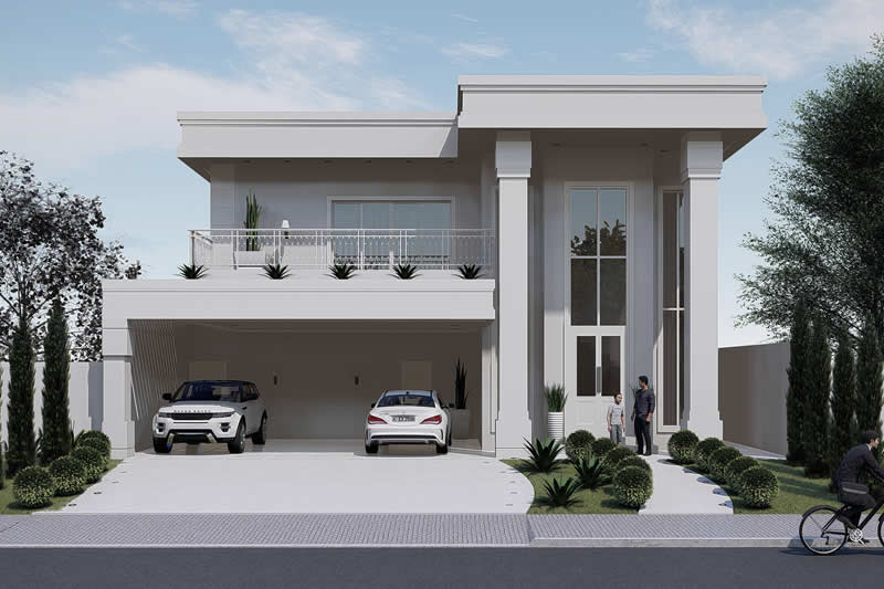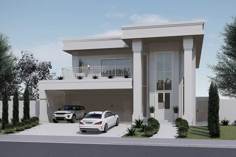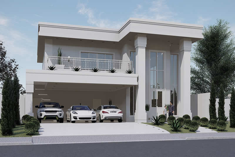 Essa é sem dúvida nenhuma uma das casas mais imponentes que já projetamos. Com uma bela fachada neoclássica, esse sobrado possui 3 vagas na garagem. Entrando pela porta principal, temos uma sala de estar já com vista para a escada e um bar. No fundo temos uma ótima área de lazer, com churrasqueira, deck e piscina. No total são 4 dormitórios, sendo um deles no pavimento térreo.