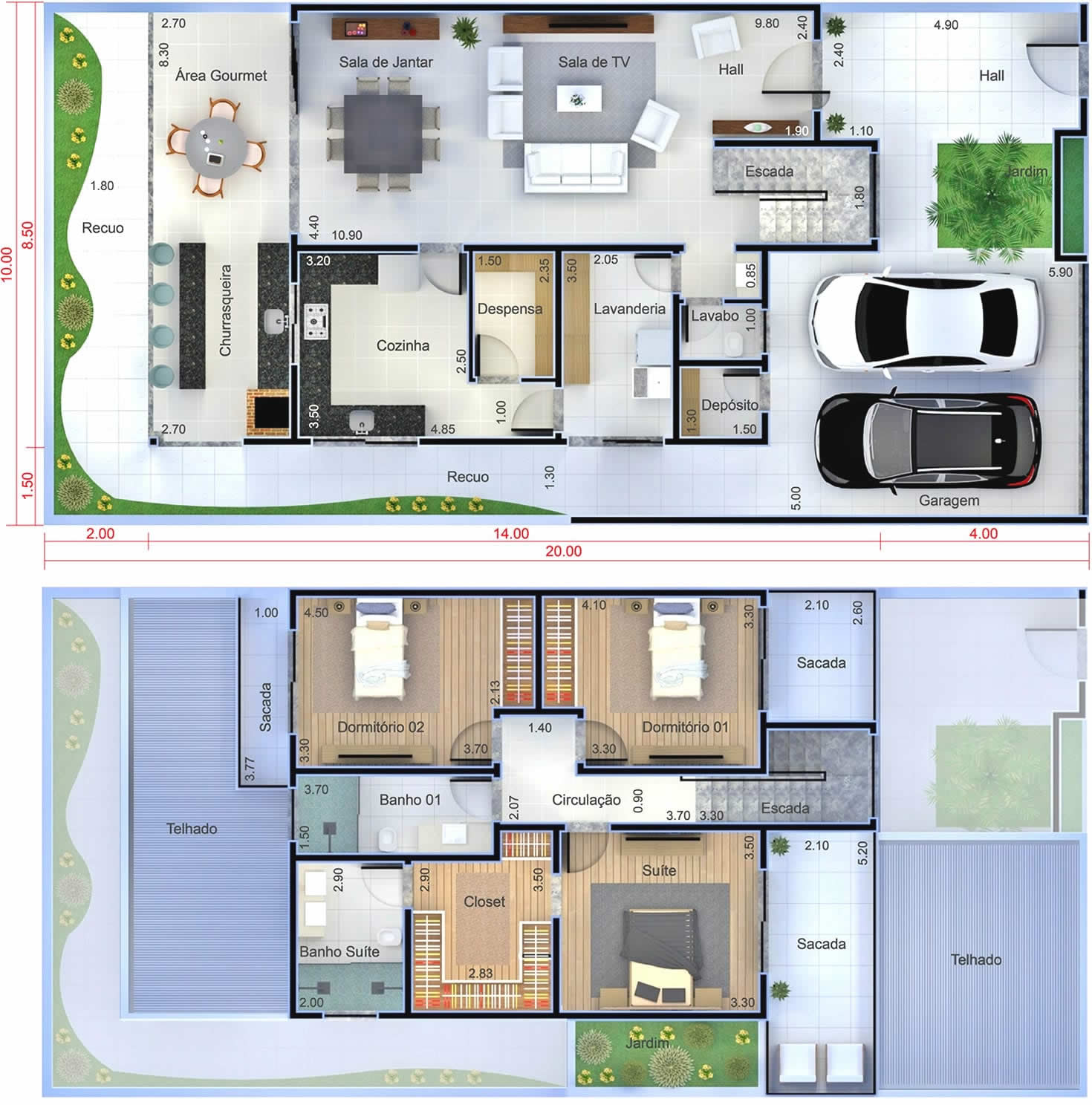 Conheça um dos nossos projetos favoritos, com uma fachada moderna e telhado embutido, essa casa possui garagem para dois carros, jardim na estrada social e três dormitório no pavimento superior, sendo um de casal com suíte e closet. Todos os quartos tem um ótimo aproveitamento dos espaços com guarda-roupas embutidos. O pavimento superior fica bem isolado da parte social da casa garantindo uma maior intimidade da família. Na área social da casa temos o pavimento térreo, onde sala de tv, sala de jantar e cozinha são integradas e com acesso para uma ótima área gourmet, um local para aproveitar o convívio em família e com os amigos. Com uma ótima distribuição dos cômodos, conseguimos liberar espaço no fundo do terreno para um jardim planejado, perfeito para momentos de lazer.