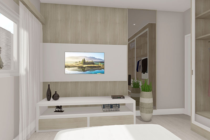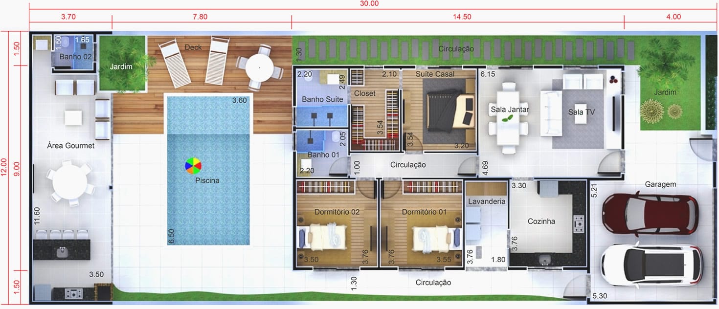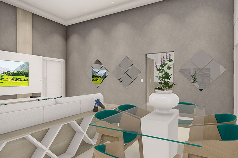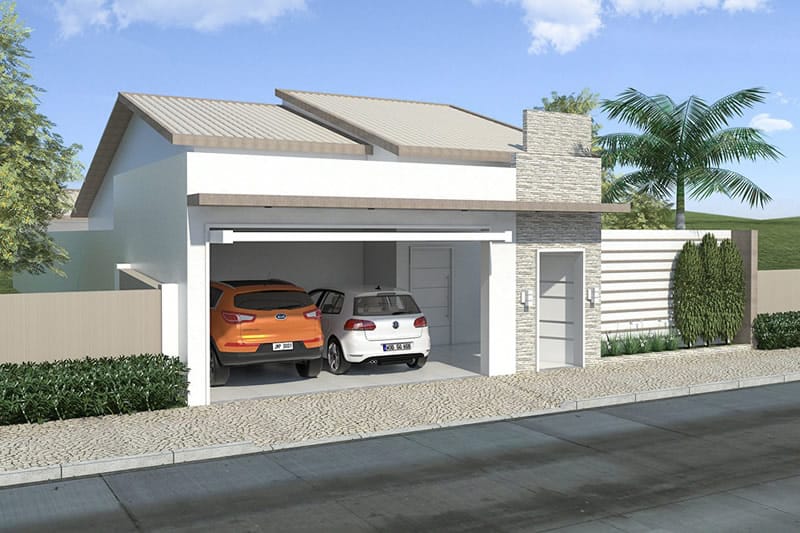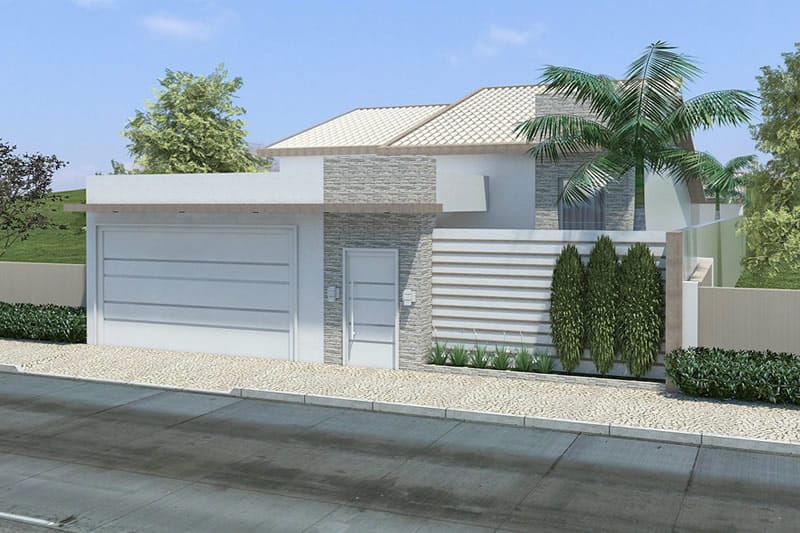 Esse é um ótimo exemplo de casa moderna, mas que tem como característica separar a área de lazer da parte íntima da casa. Com paredes bem alinhadas, ela proporciona um ótimo custo benefício na hora de construir. Essa planta possui 3 quartos – sendo um deles com closet e suíte – sala de jantar e tv integradas, e cozinha próxima a lavanderia. A garagem foi planejada para guardar 2 carros e no fundo temos uma espaçosa área de lazer com piscina e área gourmet.