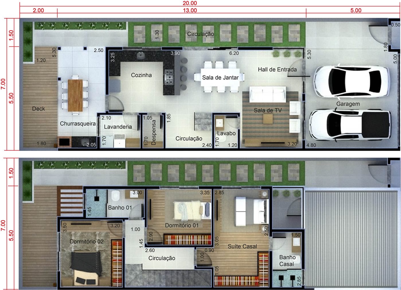 Essa é uma ótima opção de planta para você que quer construir um sobrado em um terreno de 7 de frente por 20 metros de comprimento. A casa conta com a área de convívio no pavimento inferior (incluindo uma área gourmet), e em cima, temos 3 quartos sendo o da frente uma espaçosa suíte de casal.