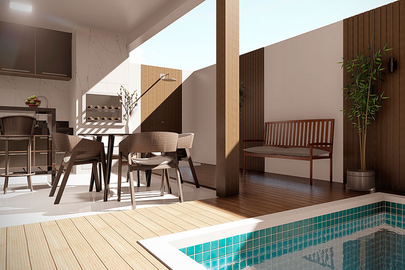 Sobrado com piscina e deck de madeira