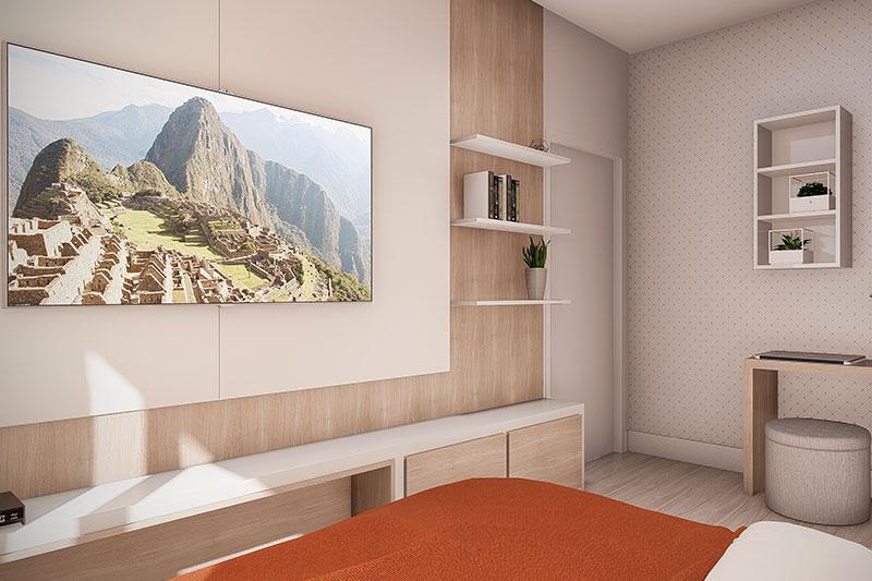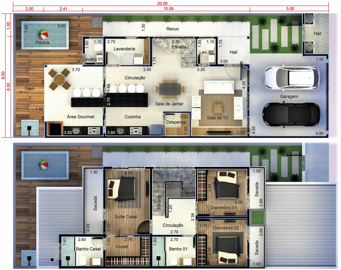 Essa é uma das nossas melhores plantas de sobrado para terrenos com 8 metros de frente. No pavimento térreo inserimos os cômodos de convívio, como sala de tv, sala de jantar, cozinha e a área de lazer com churrasqueia e piscina. Já no pavimento superior privilegiamos a parte íntima da casa, com os 2 quartos e uma ótima suíte com closet para o casal.