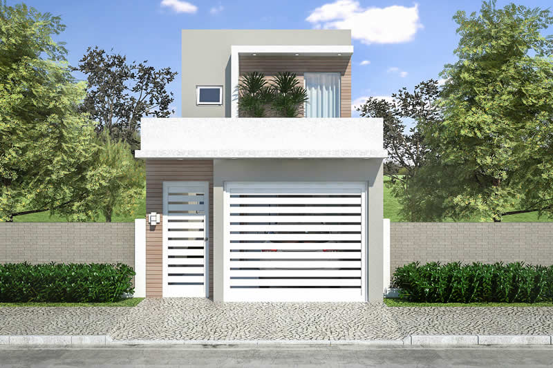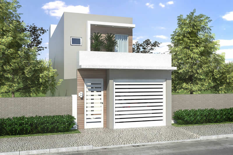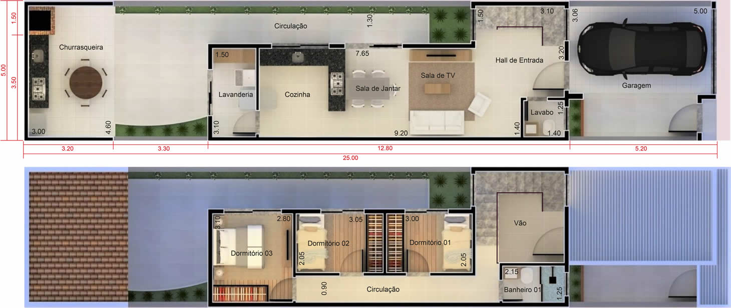 Essa é uma ótima opção de sobrado para terrenos com 5 metros de largura. No pavimento inferior temos a parte social da casa, com sala de tv, jantar, cozinha, lavanderia e área de lazer. Já em cima fica a parte íntima, com 3 quartos, sendo um de casal.