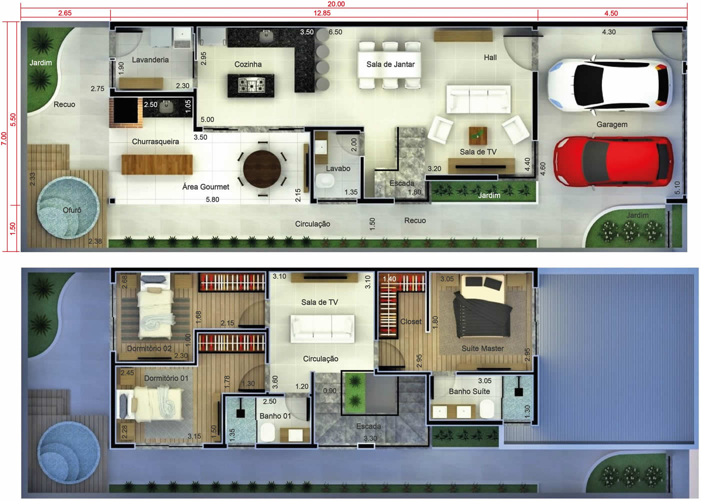 Esta planta apresenta a casa de forma artística, possibilitando a visualização dos móveis e vegetação.
