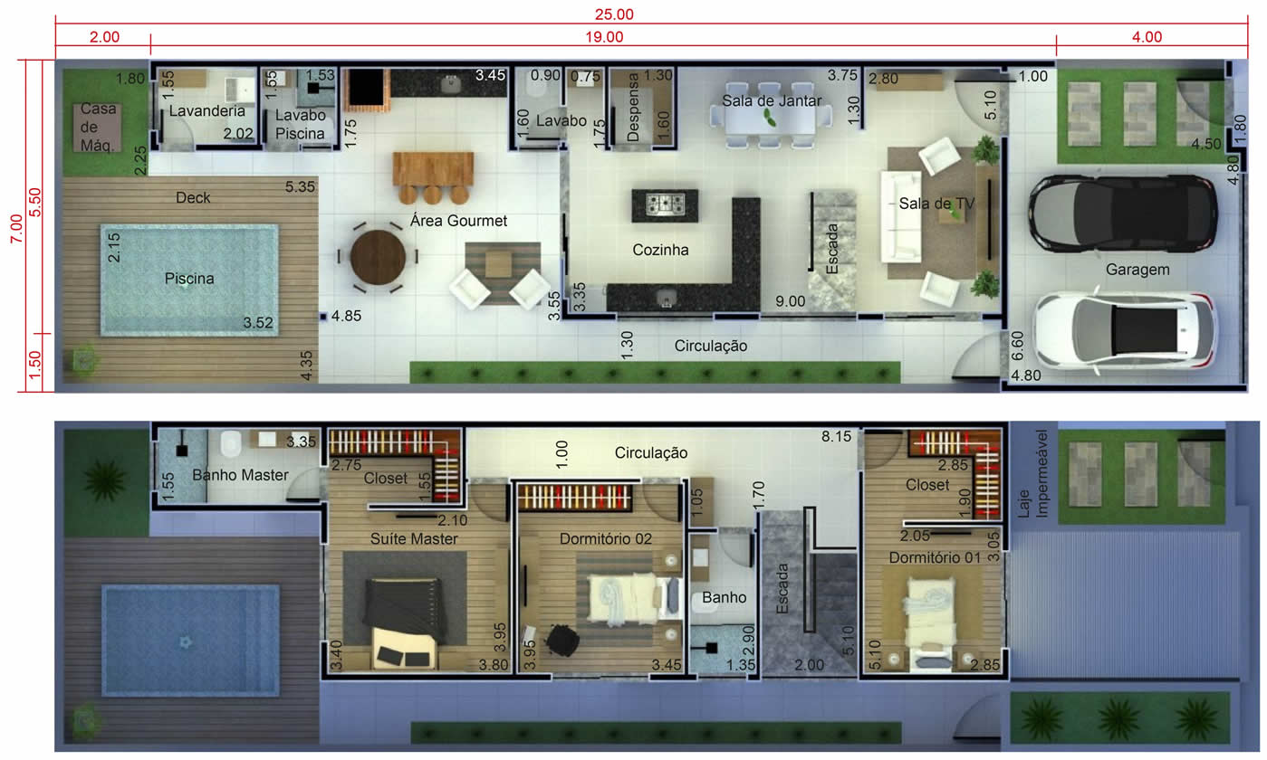 Faça um bom aproveitamento do seu terreno de 7 metros de largura por 25 metros de comprimento ao adquirir esse projeto. Com uma bela fachada moderna revestida com um material que lembra madeira, vai ser impossível passar despercebido. No pavimento inferior, nós distribuímos os cômodos de modo que eles ficassem integrados, proporcionando ambientes mais arejados e espaçosos. Em cima são 3 dormitórios, sendo o do casal nos fundos, com closet e banheiro.