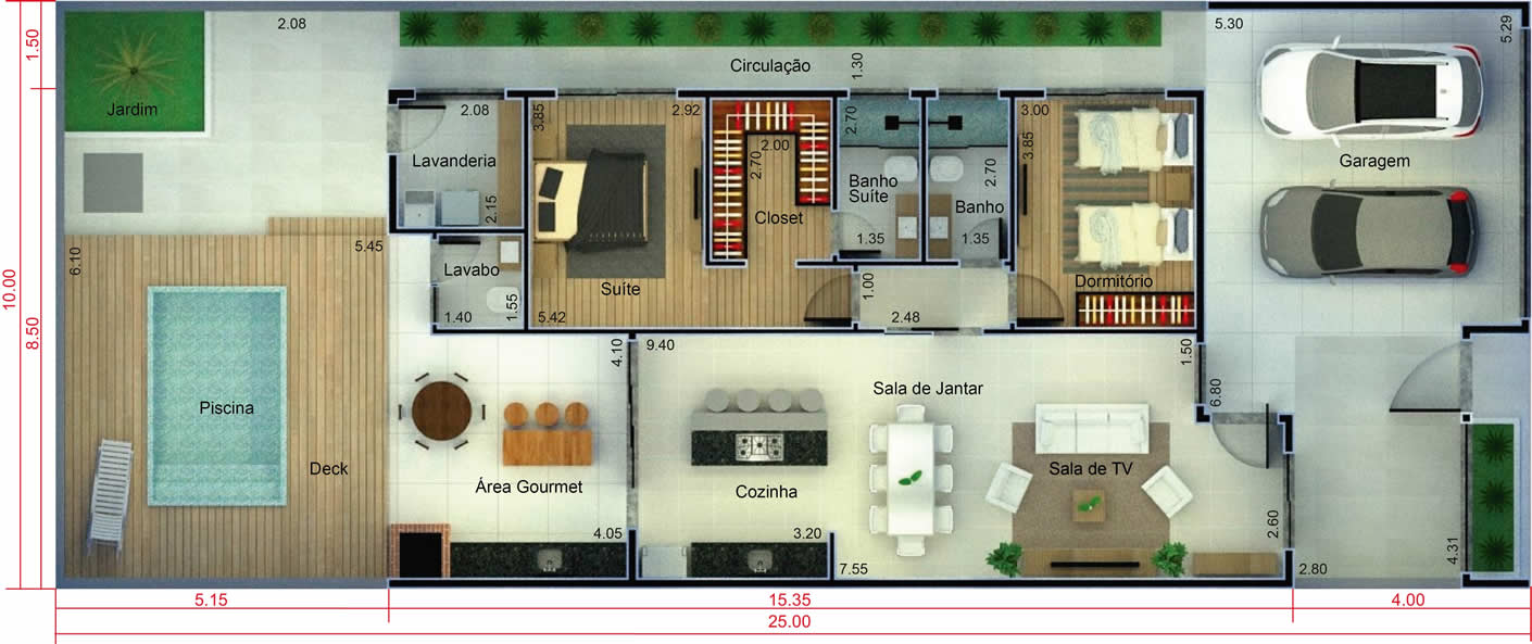 Esta planta apresenta a casa de forma artística, possibilitando a visualização dos móveis e vegetação.