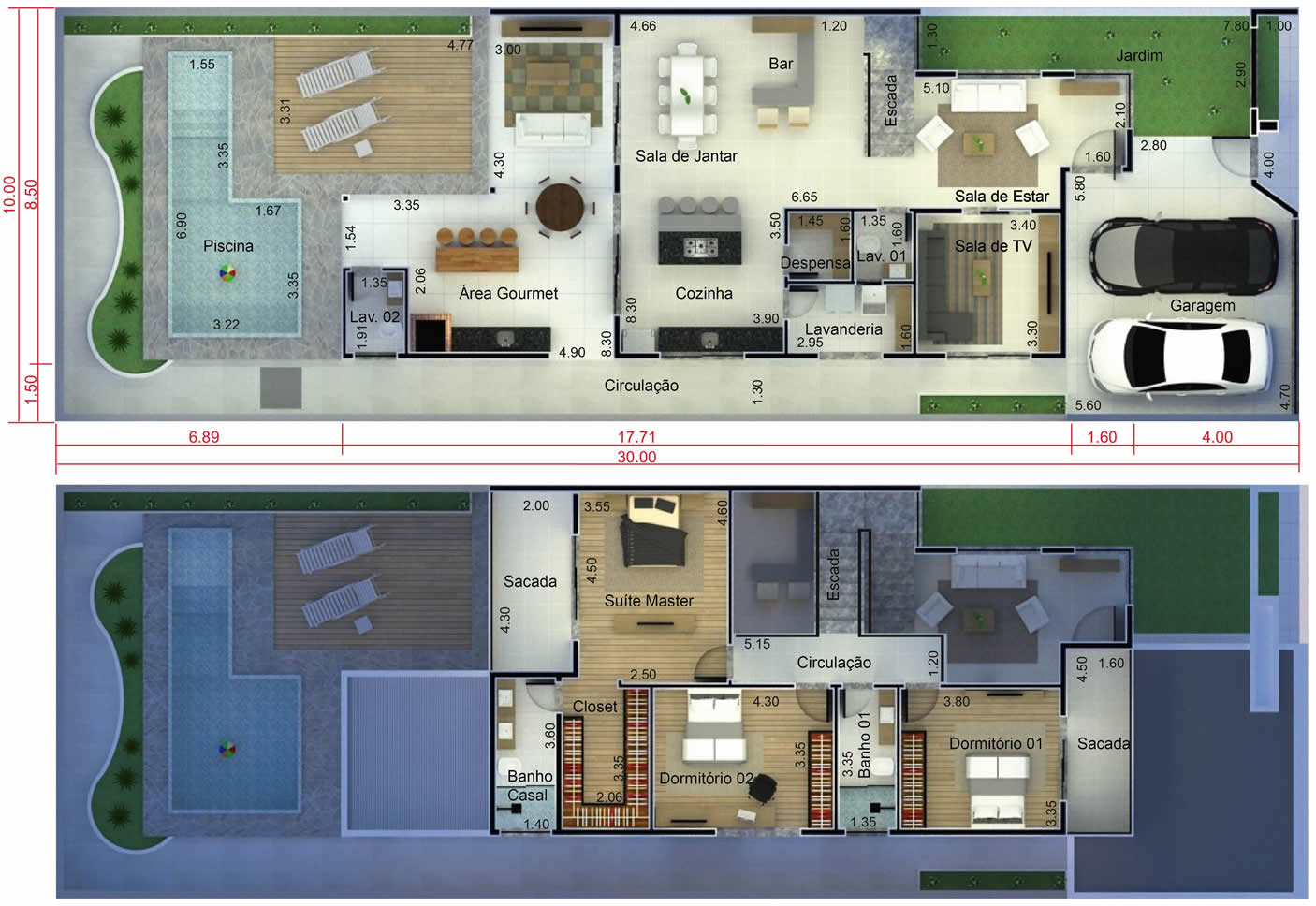 Esta planta apresenta a casa de forma artística, possibilitando a visualização dos móveis e vegetação.
