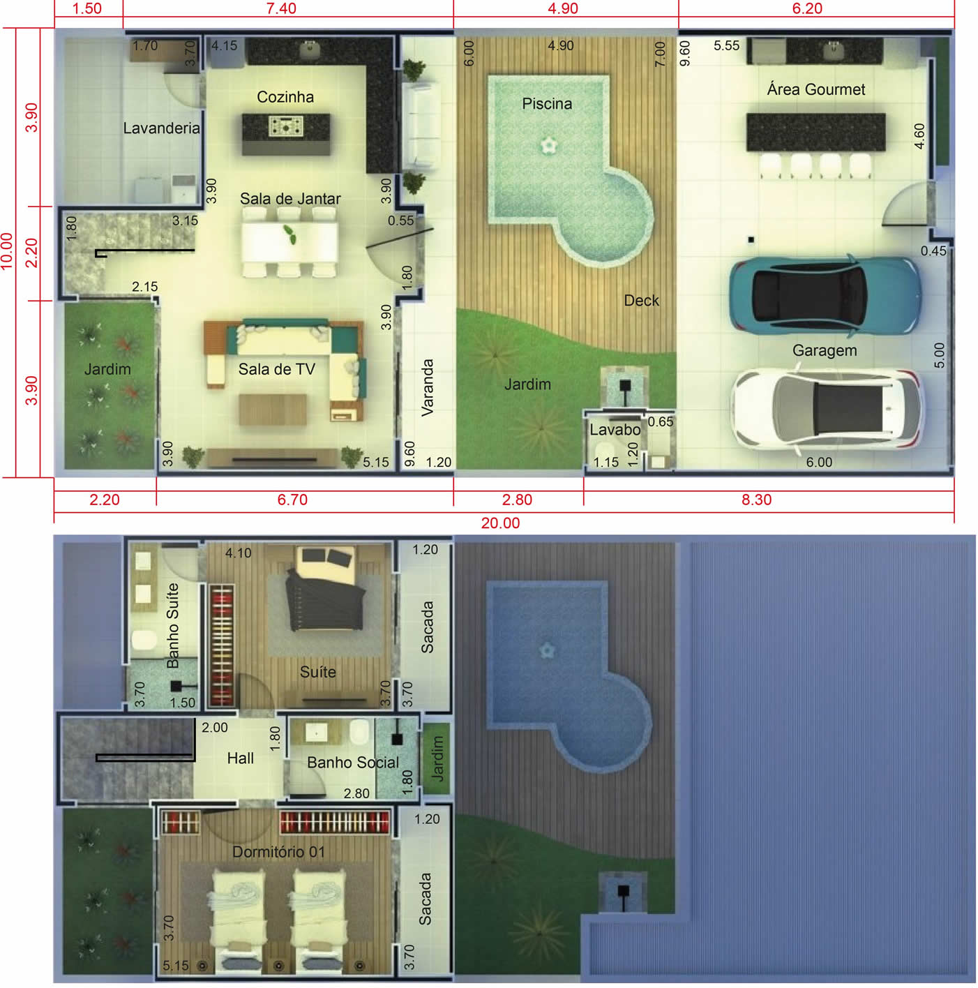 Essa é uma ótima opção de planta para quem quer priorizar a área de lazer em um terreno menor. Por isso colocamos a área gourmet e a piscina na parte da frente do terreno, dessa forma conseguimos aproveitar a cobertura da garagem para ampliar a área coberta. Na parte mais íntima temos uma sala de TV, Jantar e Cozinha no pavimento térreo e no andar superior dois quartos com sacada, sendo um deles com banheiro.