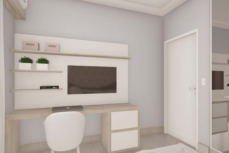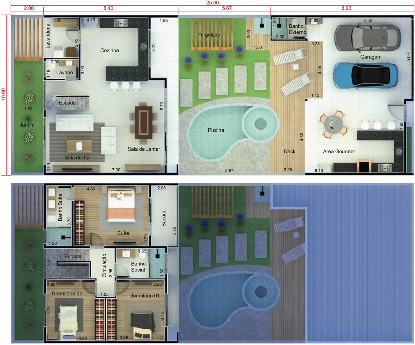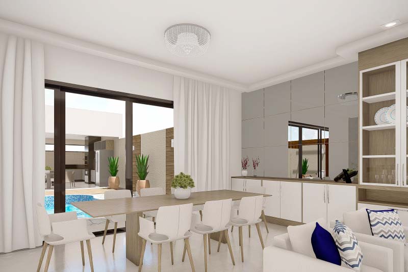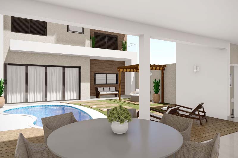 Essa planta de sobrado no fundo do terreno, é uma ótima opção para as pessoas que querem privilegiar a área de lazer. Uma das principais vantagens dessa planta é a possibilidade de ampliar a cobertura da área de lazer utilizando a garagem em dias de confraternização. Nos fundos, temos um sobrado com sala de TV, jantar e cozinha em baixo, enquanto em cima são 3 quartos, sendo um deles uma suíte com sacada.