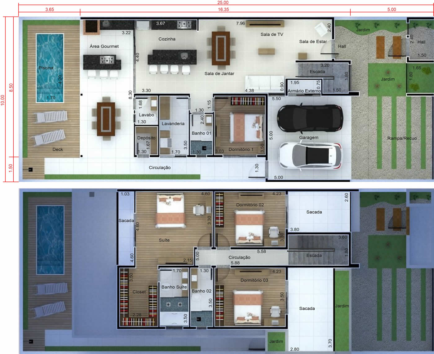 Esta planta apresenta a casa de forma artística, possibilitando a visualização dos móveis e vegetação.