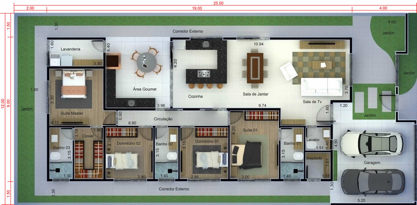 Esta planta apresenta a casa de forma artística, possibilitando a visualização dos móveis e vegetação.