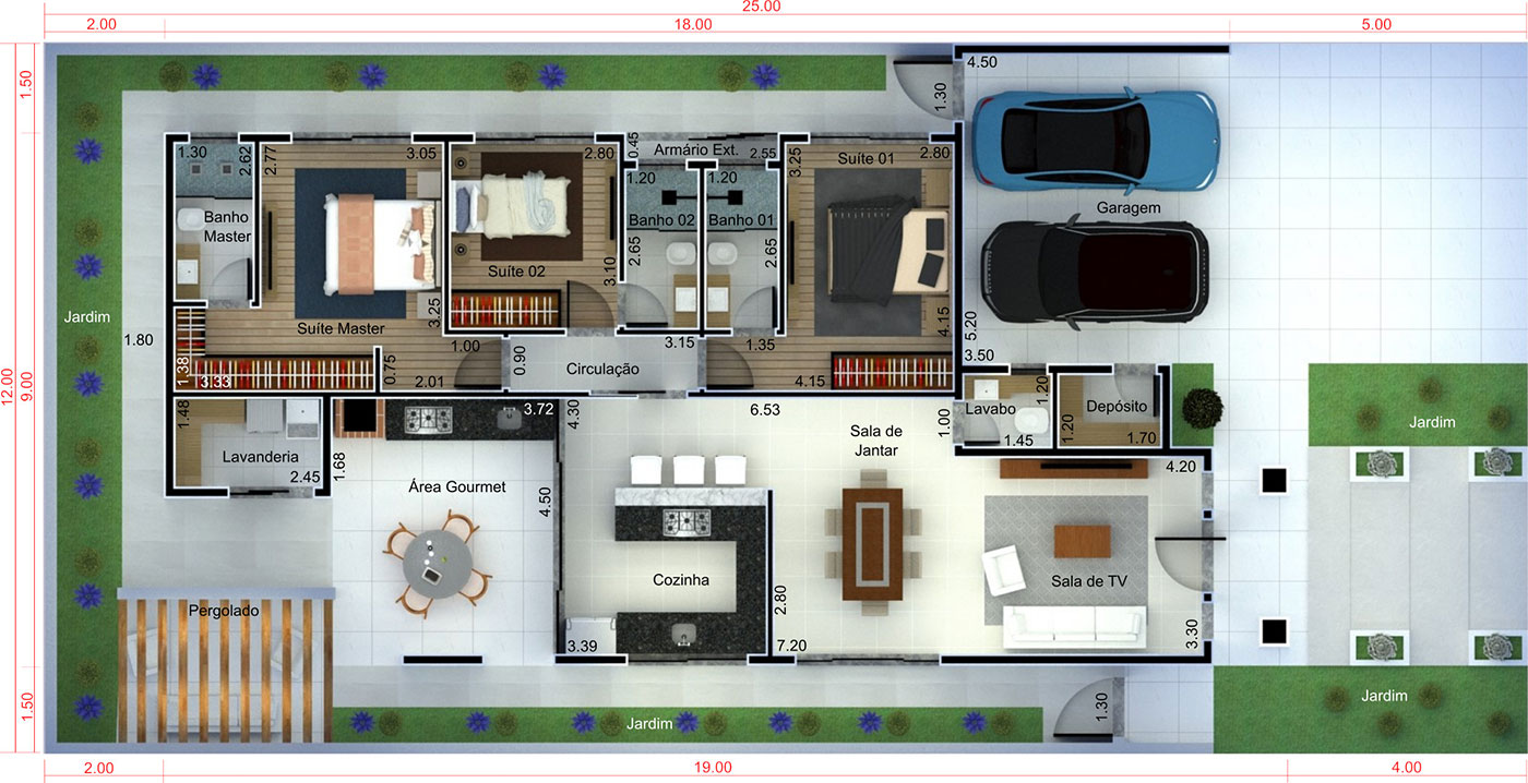 Esta planta apresenta a casa de forma artística, possibilitando a visualização dos móveis e vegetação.