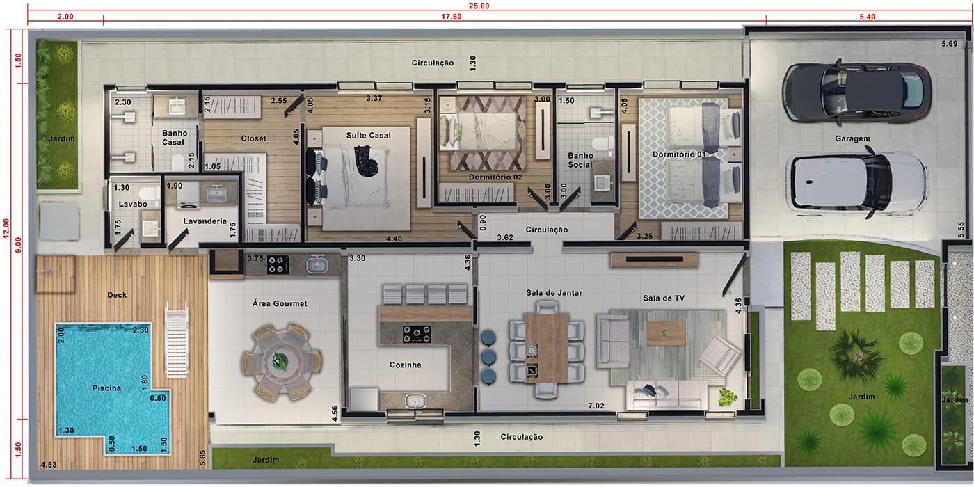 Esta planta apresenta a casa de forma artística, possibilitando a visualização dos móveis e vegetação.