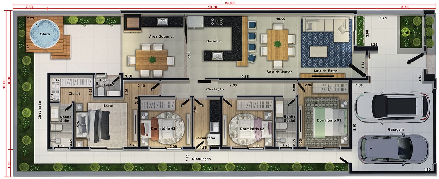 Esta planta apresenta a casa de forma artística, possibilitando a visualização dos móveis e vegetação.