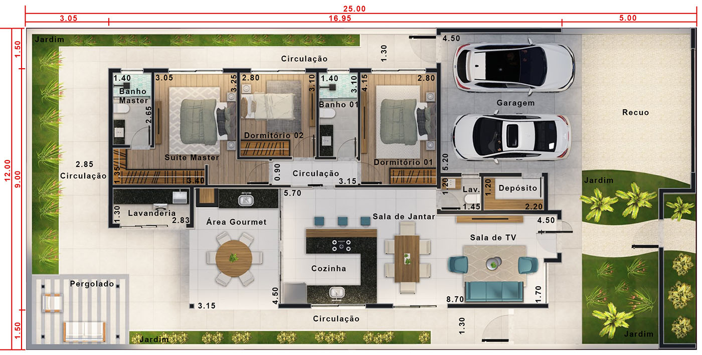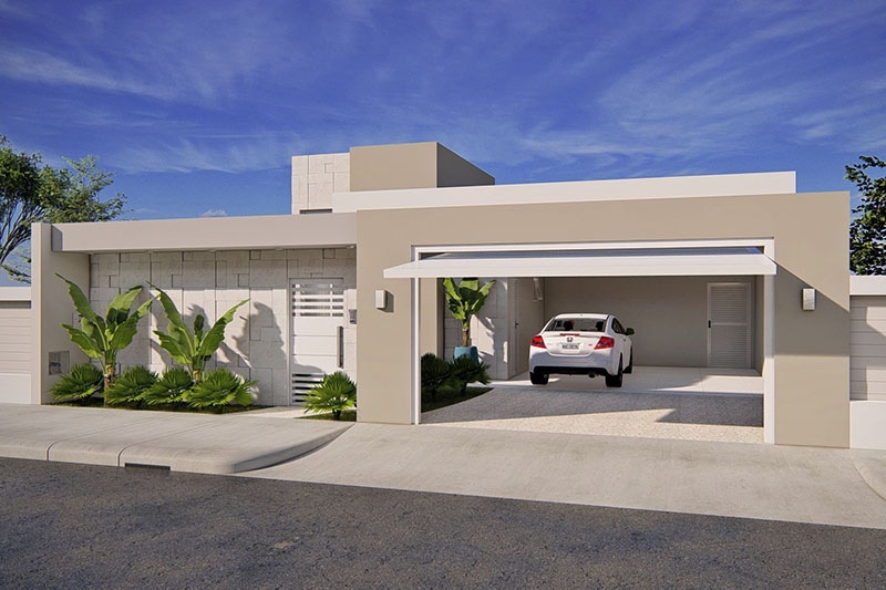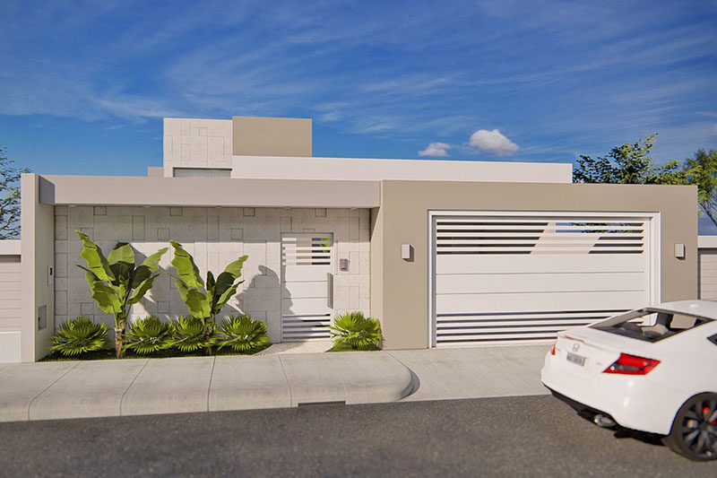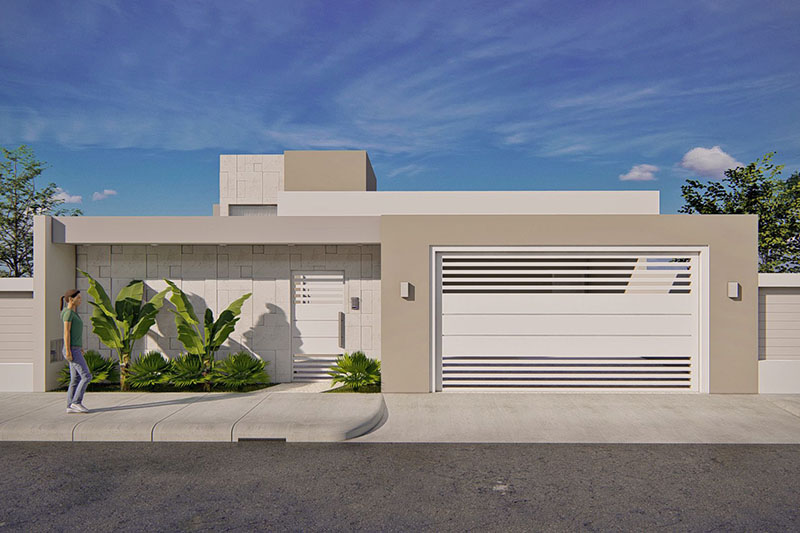 Esse projeto, desenvolvido em um terreno de 12x25m, possui uma fachada com revestimentos 3D trazendo sofisticação e modernidade. A casa conta com a área íntima totalmente separada da área social, o que possibilita uma privacidade maior aos moradores, pensando nisso foi projetado um lavabo ao lado da sala de TV, evitando utilizar o banheiro dos quartos. A porta de vidro separa a cozinha da área gourmet permitindo a integração desses dois ambientes, além de trazer uma excelente ventilação e iluminação natural para o interior. A lavanderia ao fundo e o depósito ao lado da garagem são dois pontos essenciais para a organização no dia a dia.